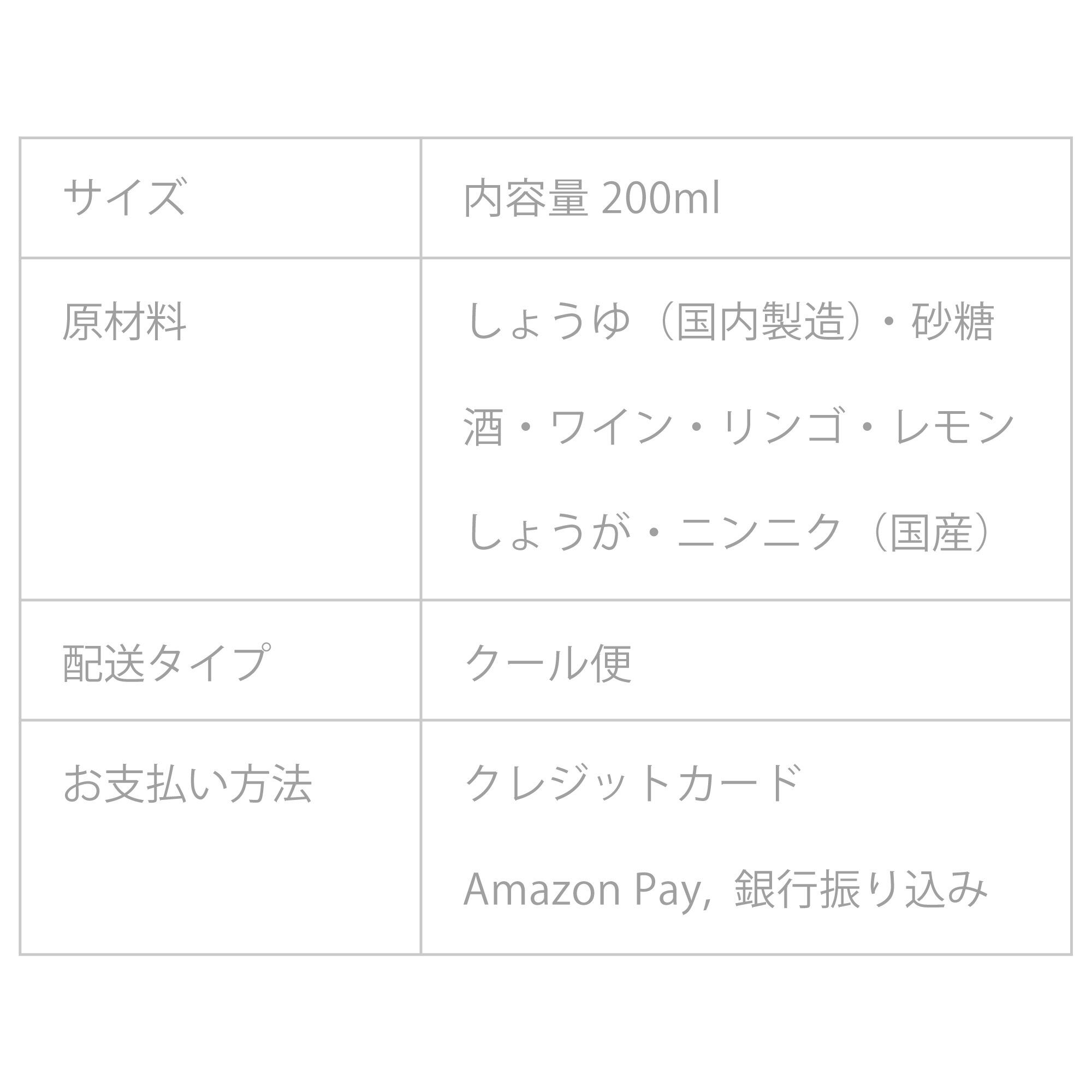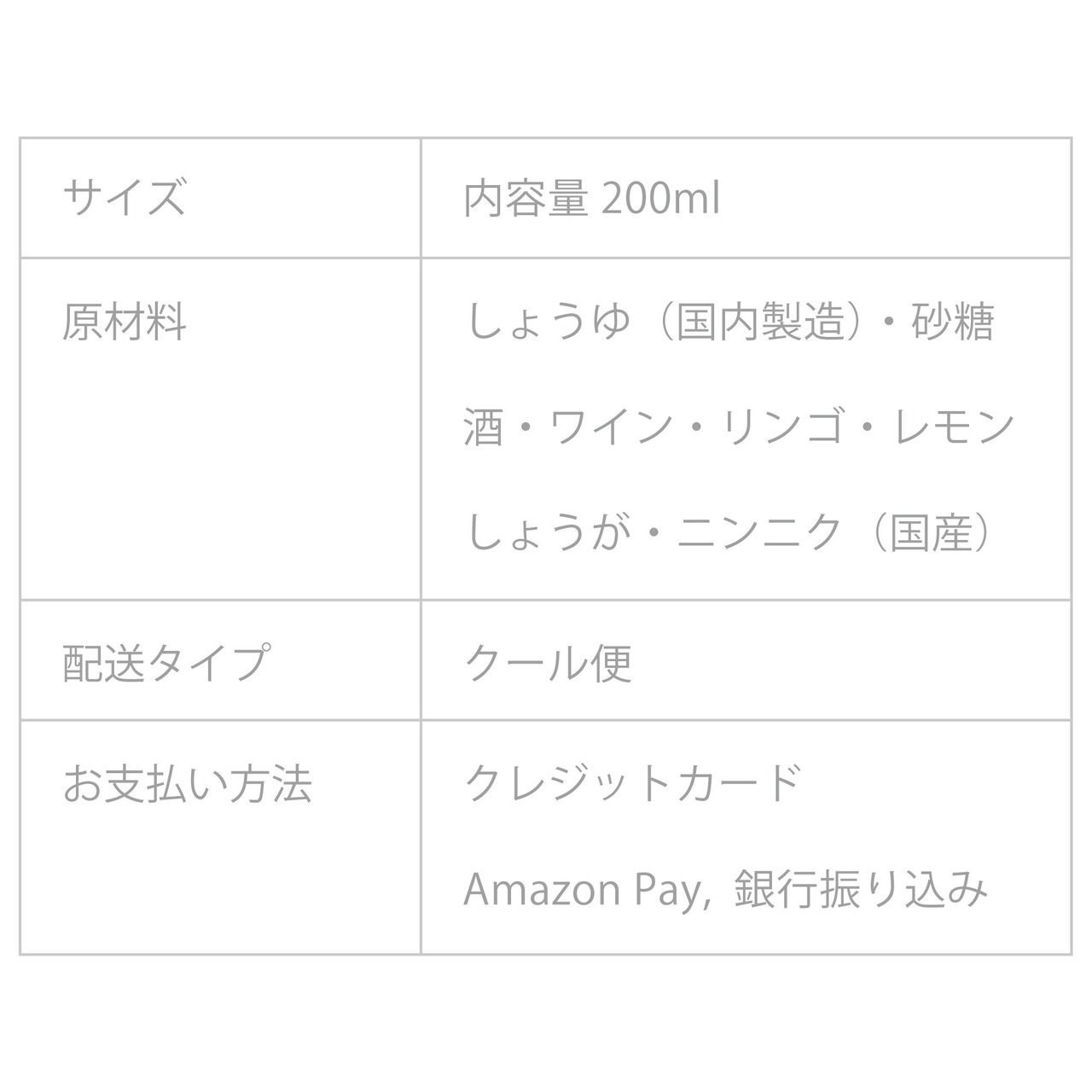 原材料 :しょうゆ(国産製造)・砂糖・酒・ワイン・リンゴ・レモン・しょうが・ニンニク(国産)
